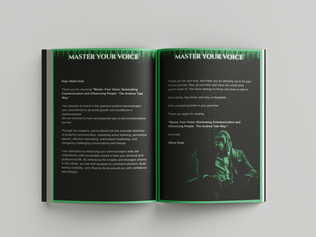 Don’t settle for mediocrity. Elevate your communication and influence to extraordinary heights with "Master Your Voice: Dominating Communication and Influencing People The Andrew Tate Way." Whether you’re a business leader, aspiring entrepreneur, or someone looking to enhance personal relationships, this premium eBook is your ultimate resource.